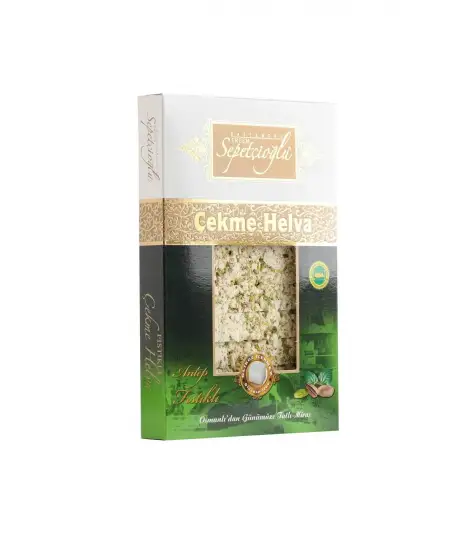 Antep Fıstıklı Çekme Helva 550 gr (TR) İçindekiler: Buğday unu, toz şeker, bitkisel margarin, antep fıstığı (%2,5),asitliği düzenleyici (sitrik asit E330). ; (EN) Ingredients: Wheat flour, sugar, vegetable oil, pistachio (2,5%),acidity regulator (citric acid E330). ; (DE) Zutaten: Weizenmehl, zucker, panzenöl, pistazien (2,5%),säureregulator (citronensäure E330). ; (NL) Ingrediënten: Tarwemeel, suiker, plantaardige olie, pistache (2,5%),zuurteregelaar (citroenzuur E330). ; (RU) ???????????: ????????? ????, ?????, ???????????? ?????, ??????????? (2,5%),????????? ??????????? (???????? ??????? E330). ; .(SIN330 ?????????: ???? ?????, ???, ???? ????????, ???? (2,5%),???? ????? (??? ??????? (AR) ALERJEN UYARISI: Gluten, antep fıstığı içerir. ; İz miktarda tereyağı, fındık, badem içerebilir. ; ALLERGEN WARNING: Contains gluten, pistachio. ; May contain traces of butter, hazelnut, almond. ; ALLERGEENWAARSCHUWING: Bevat graan gluten, pistache. ; Kan sporen van boter, hazelnoot, amandel bevatten.;